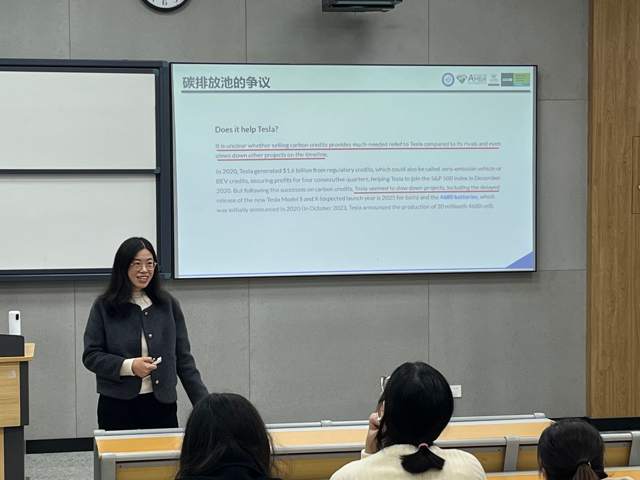 讲座核心部分聚焦 “碳排放池” 这一灵活合规机制。王娇副教授以汽车行业为典型案例,解析欧盟碳排放标准、美国加州排放规则及我国双积分政策下,企业面临的合规压力与罚款风险。她通过大众、特斯拉、五菱红光等企业的实战案例,生动阐释了碳排放池的运作逻辑 —— 高排放企业与低排放企业通过合作履约,既帮助高排放企业规避巨额罚款,又让低排放企业通过碳配额交易实现额外盈利。同时,她也客观呈现了该机制的争议点,如是否影响整体减排效果、是否削弱企业转型动力等。