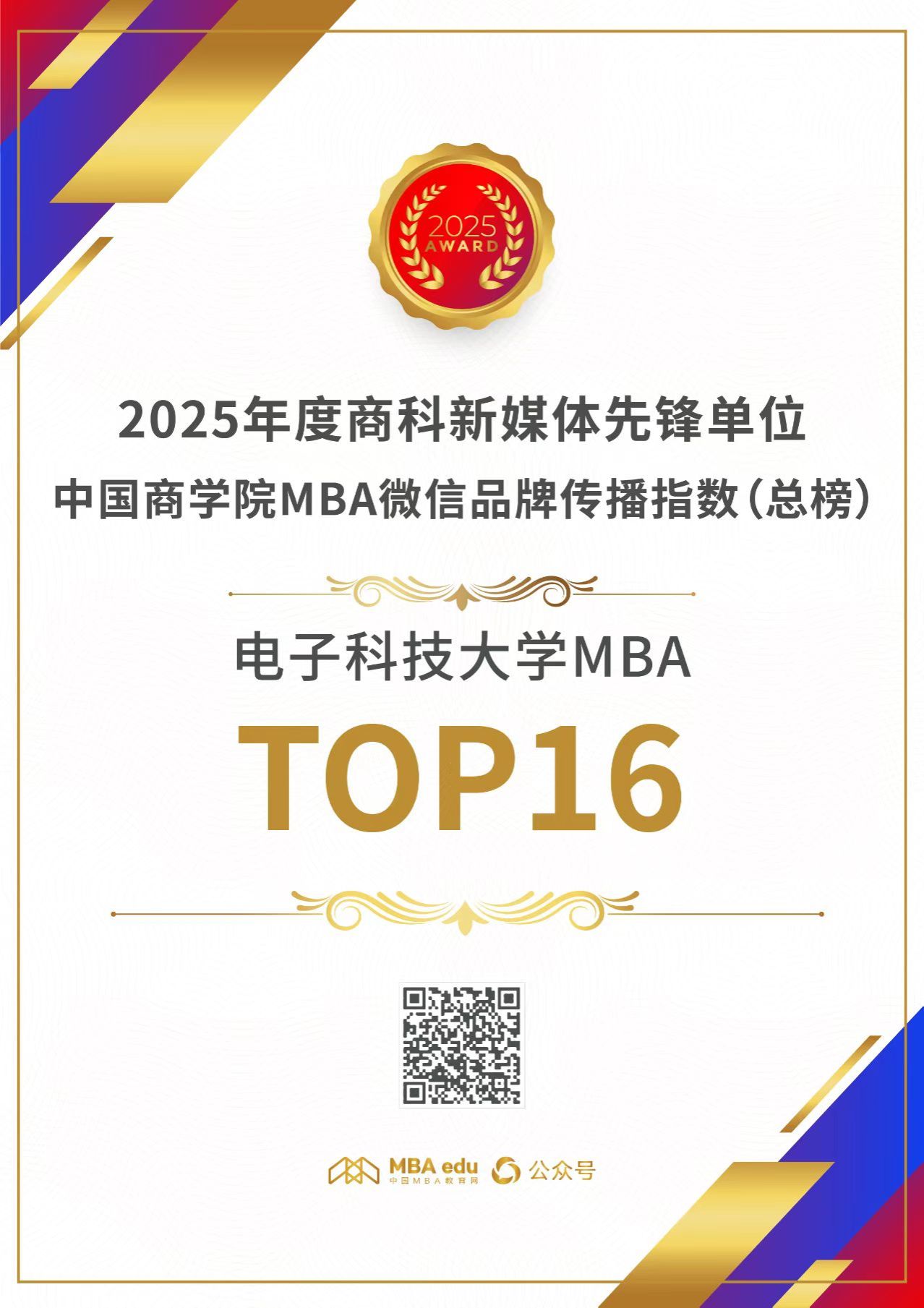 “电子科技大学MBA”微信公众号聚焦商科教育,展示项目风采,在内容、互动、风格等方面不断加强创新投入,持续输出优质内容,在本次大会中荣获“2025年度商科新媒体先锋单位中国商学院MBA微信品牌传播指数(总榜)TOP16”、“2025年度商科新媒体先锋单位中国商学院MBA微信品牌关注度(分榜)TOP16”,“2025年度商科新媒体先锋单位中国商学院MBA微信品牌运营院校劳模(分榜)TOP16”,微信推文“【投票啦】电子科大经管学院2025级MBA班级风采展示天团等你来定”荣获“2025年度商科新媒体先锋单位中国商学院MBA微信十大热文TOP2”。
