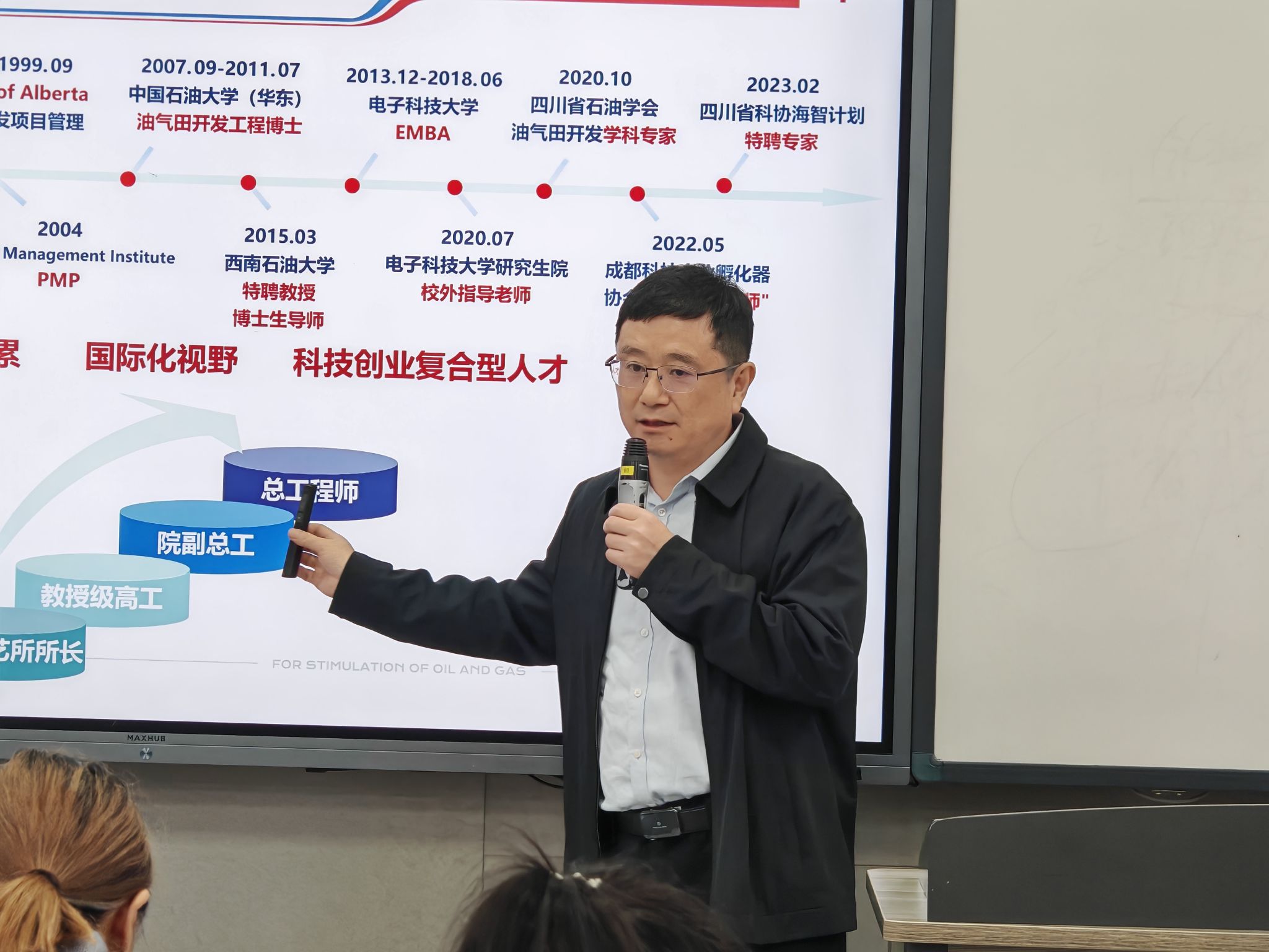 任山博士以“我适合创业吗?”为主题,从个人求学与职业发展历程切入,生动讲述了从增产工艺所所长到总工程师的成长路径。他通过真实创业案例、研发管理实践、融资策略及企业发展历程,系统梳理了一家科技企业从初创到壮大的完整脉络,并对公司战略布局与资本发展路径的深入解读,激发了同学们的广泛思考和兴趣。