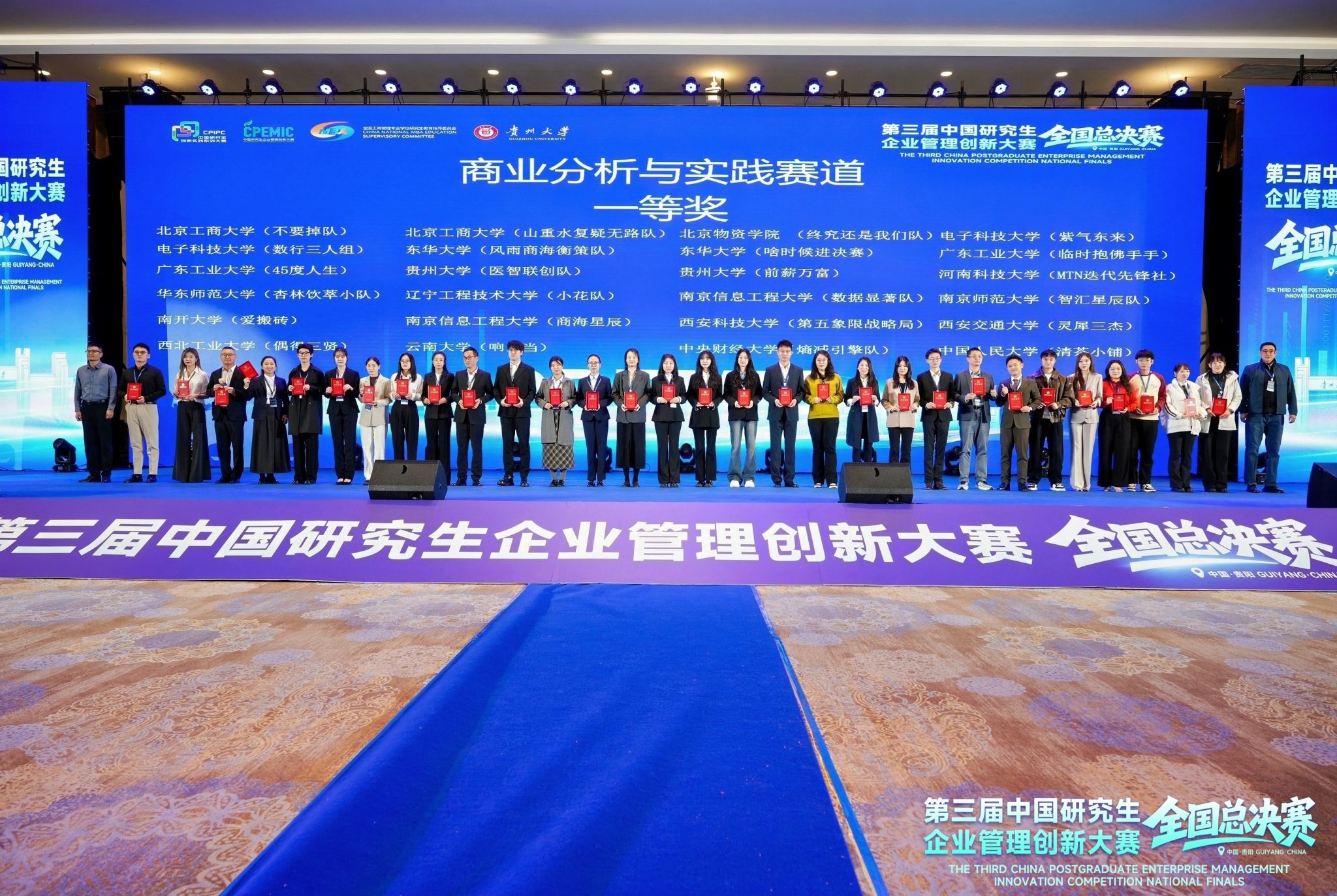 2025年11月8至9日,第三届中国研究生企业管理创新大赛全国总决赛在贵阳圆满落幕。本届大赛共有来自全国150所高校的411支队伍晋级全国总决赛。电子科技大学参赛队伍荣获一等奖2项,二等奖7项,三等奖3项;学校连续三年获评“优秀组织奖”。其中一等奖获奖团队“数行三人组”同时获“见数实践奖”。我校一等奖数量及获奖总数均位列全国前10%,展现出卓越的创新实力与团队风采。