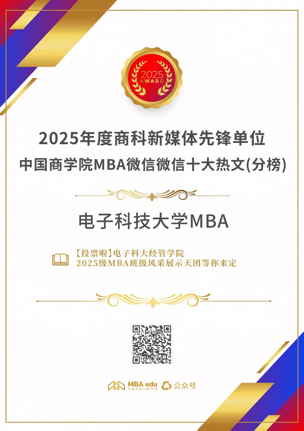 “电子科技大学MBA”微信公众号聚焦商科教育,展示项目风采,在内容、互动、风格等方面不断加强创新投入,持续输出优质内容,在本次大会中荣获“2025年度商科新媒体先锋单位中国商学院MBA微信品牌传播指数(总榜)TOP16”、“2025年度商科新媒体先锋单位中国商学院MBA微信品牌关注度(分榜)TOP16”,“2025年度商科新媒体先锋单位中国商学院MBA微信品牌运营院校劳模(分榜)TOP16”,微信推文“【投票啦】电子科大经管学院2025级MBA班级风采展示天团等你来定”荣获“2025年度商科新媒体先锋单位中国商学院MBA微信十大热文TOP2”。