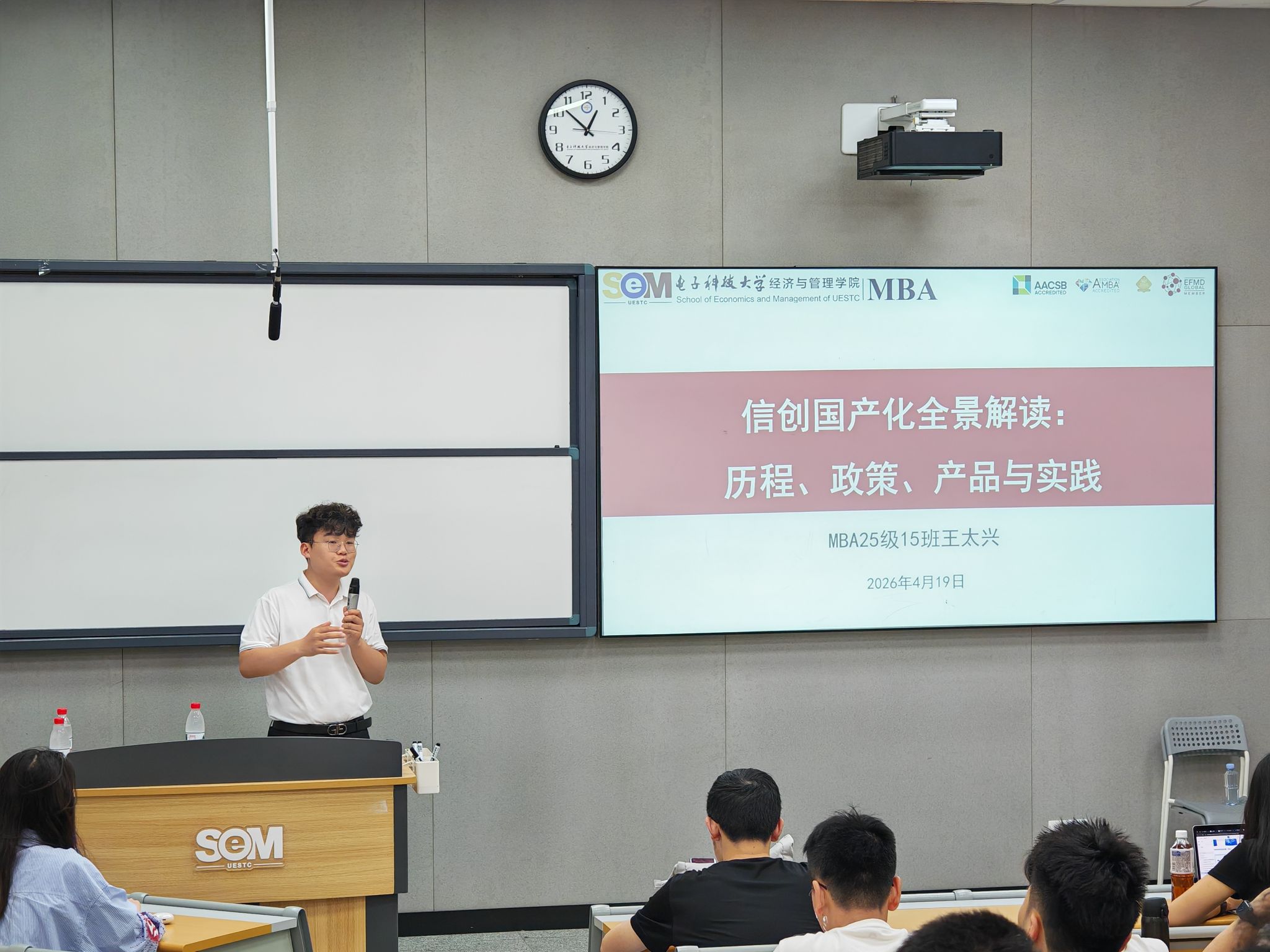 4月19日,由电子科技大学经济与管理学院 MBA 教育中心主办,MBA联合会讲座论坛部承办的明势讲堂・悦享专题讲座,在清水河校区经管楼A105顺利举办。2025级MBA 学生、深耕信创领域的IT行业解决方案工程师王太兴担任主讲嘉宾,全面拆解我国信创国产化全产业链发展全貌,众多在校MBA师生到场参与学习交流。